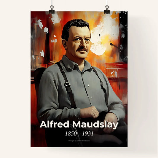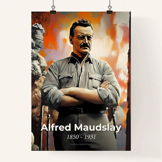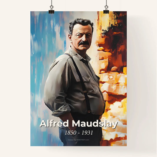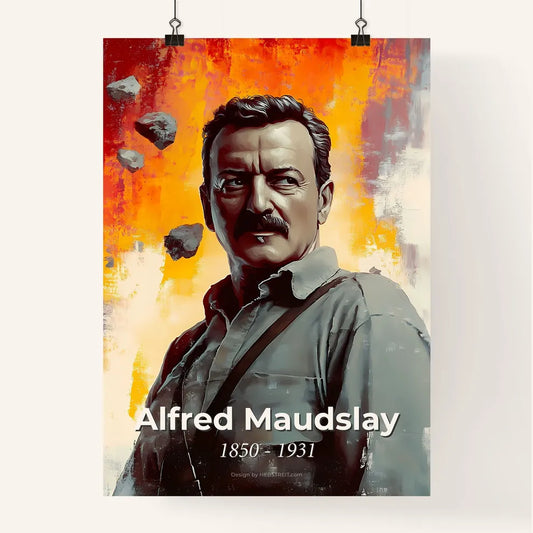 Portrait of Alfred Maudslay, 1850 - 1931. Impressionistic painting of a man with a mustache and a mustache and a bunch of rocks in the air.