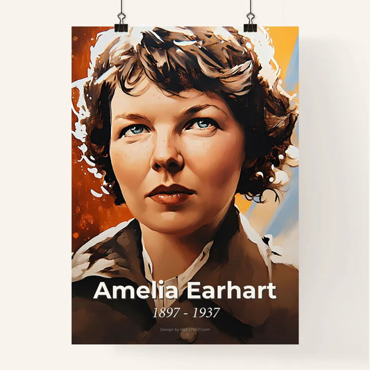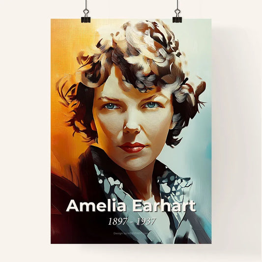 Portrait of Amelia Earhart, 1897 - 1937. Impressionistic painting of a woman with short curly hair wearing a coat and earrings.