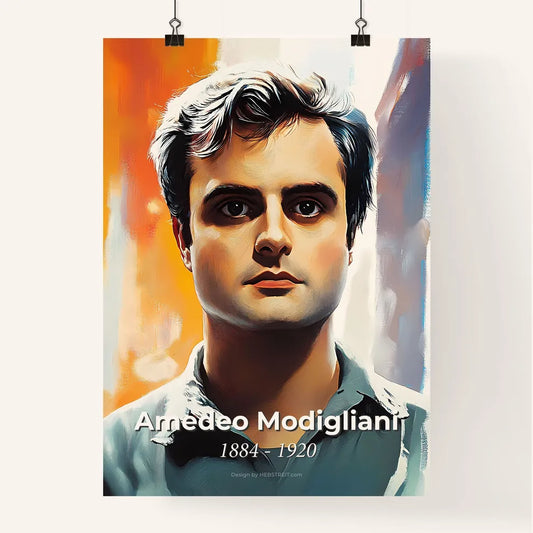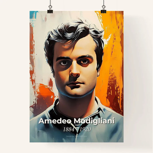 Portrait of Amedeo Modigliani, 1884 - 1920. Impressionistic painting of a man with short hair wearing a blue shirt.