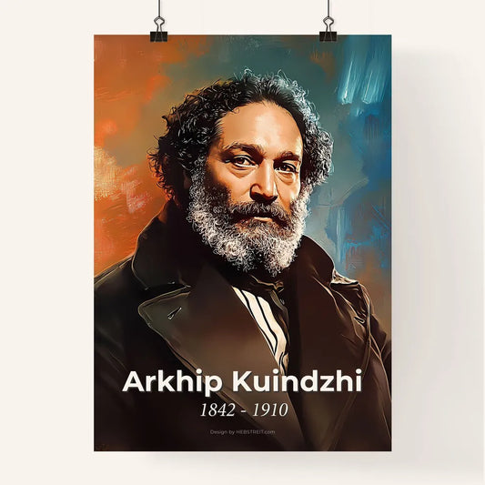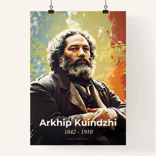 Portrait of Arkhip Kuindzhi, 1842 - 1910. Impressionistic painting of a man with a beard and mustache sitting in front of a colorful background.
