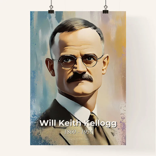 Portrait of Will Keith Kellogg, 1860 - 1951. Impressionistic painting of a man with a mustache wearing glasses.