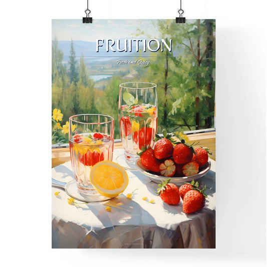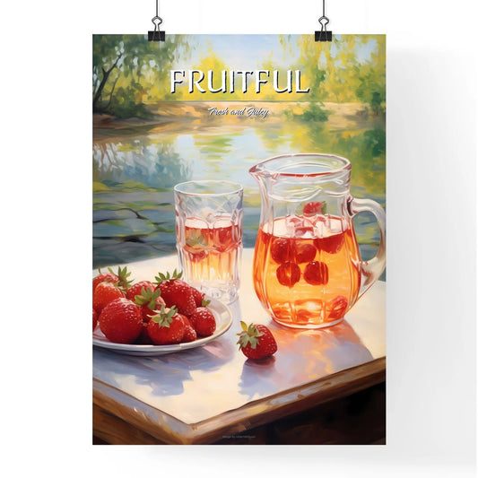 Pitcher And Glass Of Fruit Next To A Plate Of Strawberries Art Print
