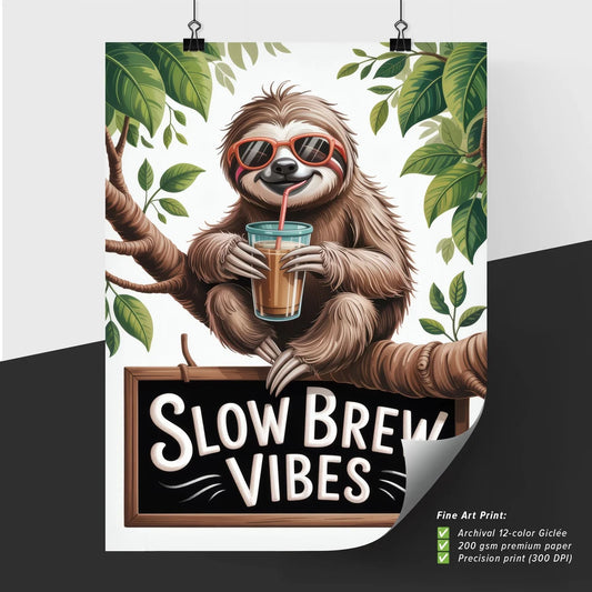 Chill Sloth Enjoying Refreshing Beverage in Tropical Setting with Playful 'Slow Brew Vibes' Sign.