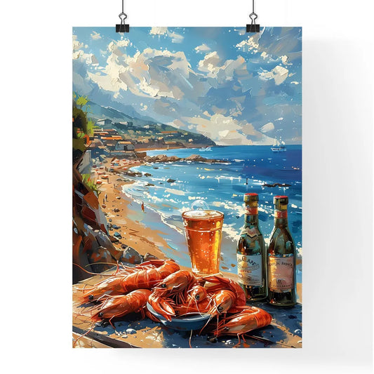 Dramatic Art Painting: Seafood Feast on the Beach with Majestic Sea View and Refreshing Beer