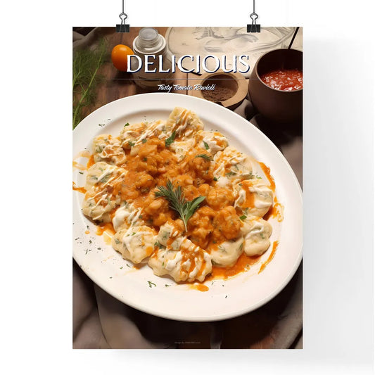 A Poster of Ravioli with tomato sauce - A Plate Of Food On A Table