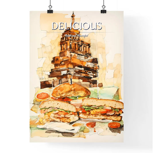 A Poster of illustration of a sandwich - A Watercolor Of A Sandwich And A Building