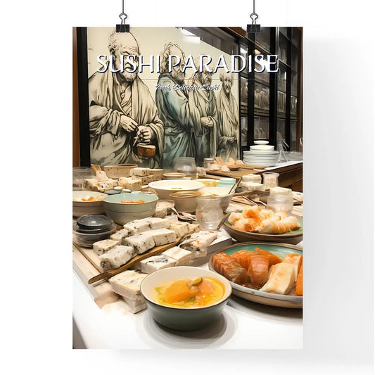 A Poster of sushi food drawing - A Man Standing In Front Of A Buffet Table Full Of Food