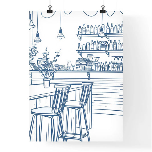 Panoramic Pencil Sketch Cafe Illustration with Linear Bottles and Shelves, Blue Lines on White, Editorial, Flawless Lines, Screen Print
