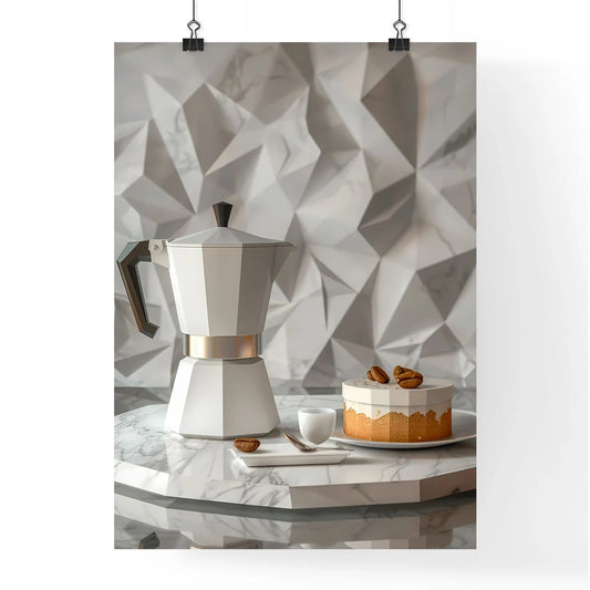 Moka Pot and Coffee Cake Origami Cubism 3D Model on Marble Table UHD 16K Painting Art