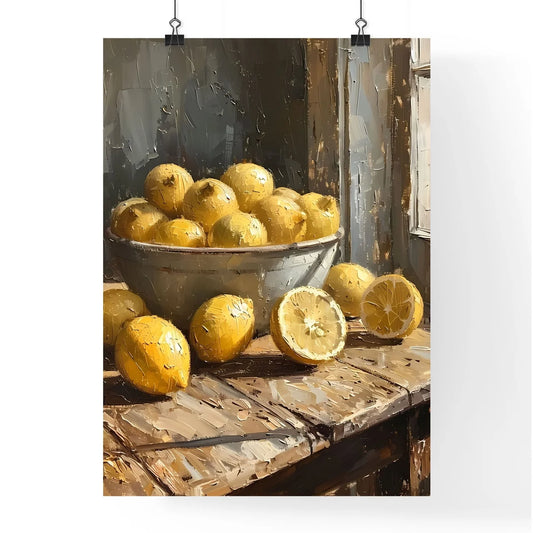 Oil Painting Still Life: Vibrant Lemons on Oak Table, Moody Vintage Artwork