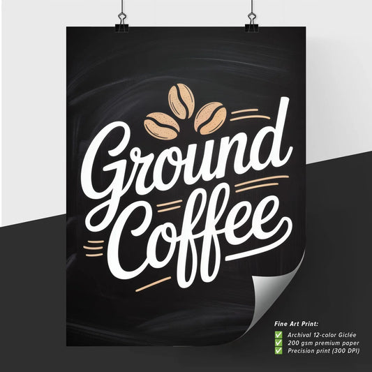 “Artistic Typography of Ground Coffee with Coffee Beans on a Chalkboard Background.”
