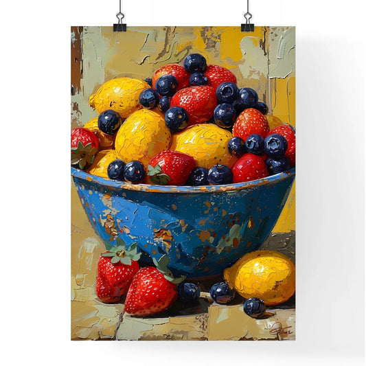 Whimsical Fruit Bowl Canvas Painting: Blue Bowl of Fruit with Strawberries and Blueberries