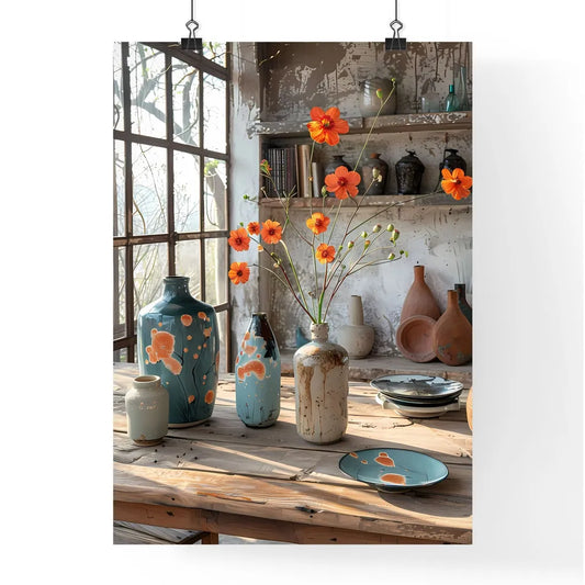 Abstract Oil Painting on Canvas Featuring Vibrant Vases and Flowers on Table with Artistic Focus