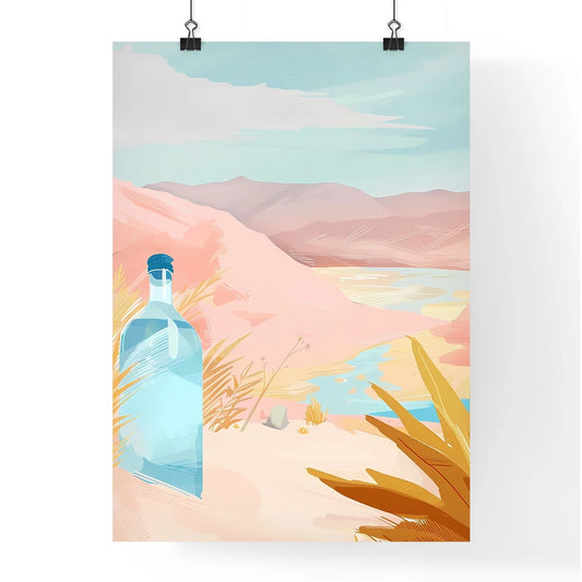 Abstract Blue Painting with Japanese Sake, Delicate Landscape, Animation Still, Bottle in Desert, Vibrant Art