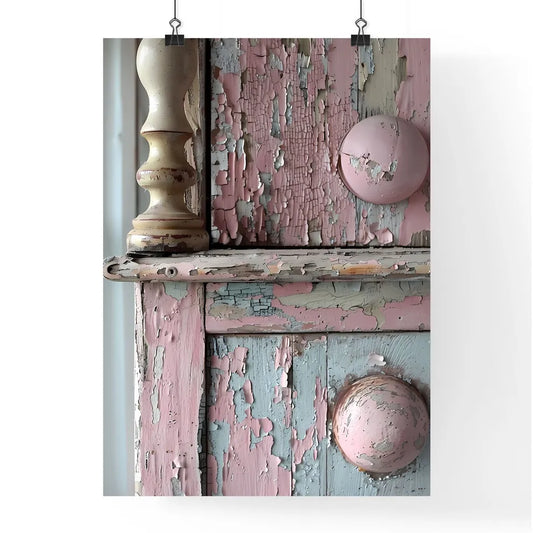 Closeup shabby chic wooden kitchen cabinets pink peeling paint neutral tones vibrant painting kitchen decor