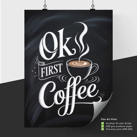Chalkboard Design: 'Ok, But First Coffee' with Illustrative Coffee Cup and Swirling Steam