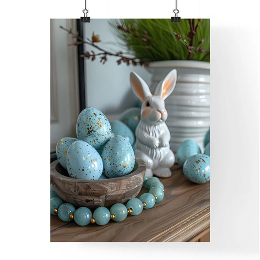 Charming Pastel Easter Decor with Pastel Bangle, Blue Eggs, and Bunny Figurines on Artistic Background