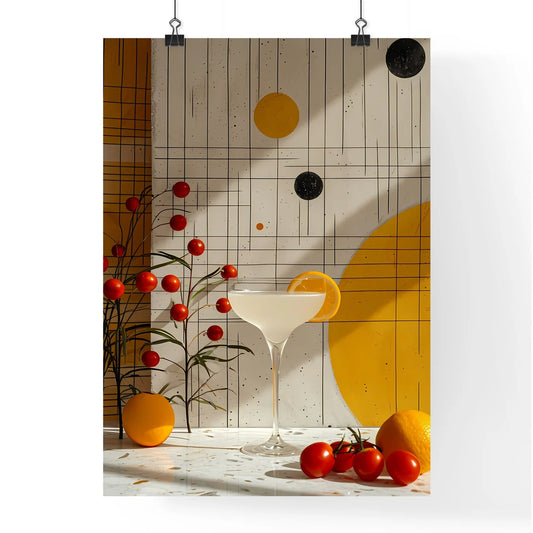 A fruity cocktail radiates hues of yellow - Art print of a glass of liquid next to fruit