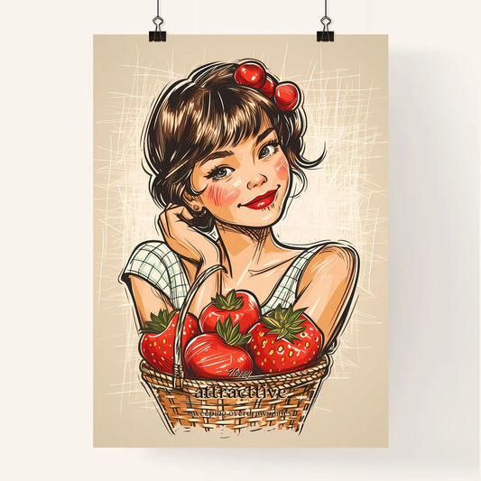 Happy, attracttive, sweeping overdrawn lines, A Poster of a woman holding a basket of strawberries