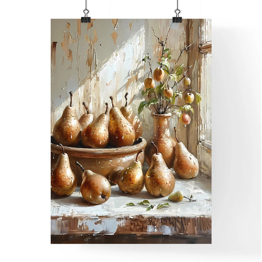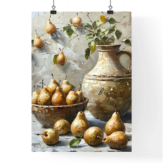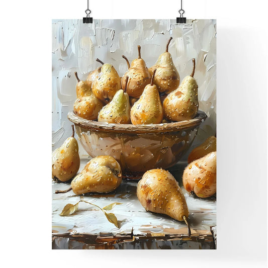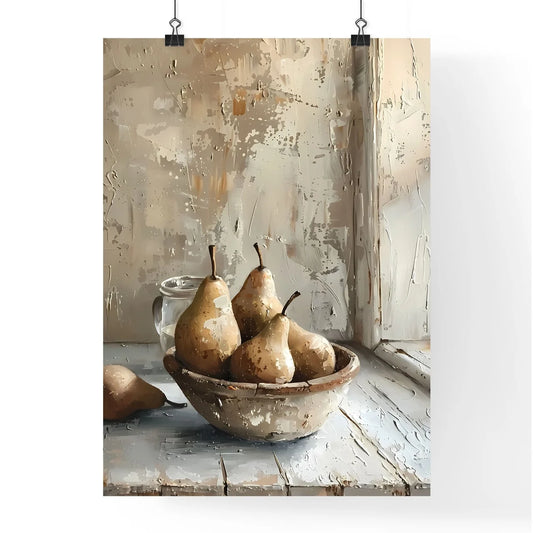 Impressionistic Pears on Counter in Rustic Bowl, Muted Colors, Dynamic Composition, Oil Painting Art