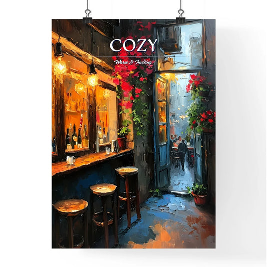 A Poster of bar warm lamp windownight - A Painting Of A Bar With Stools And Flowers