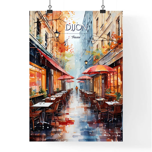Dijon, France - Art print of a watercolor of a street with tables and chairs and umbrellas