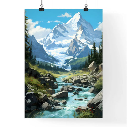 A Poster of Glacier National Park - A River Running Through A Rocky Valley With A Snowy Mountain In The Background