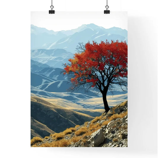 A Poster of winter desert day landscape - A Tree With Red Leaves On A Hill