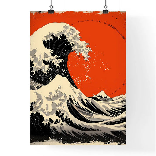 Abstract minimalist modern black and white sun over mountain line art print, orange circle, stripes, large margin