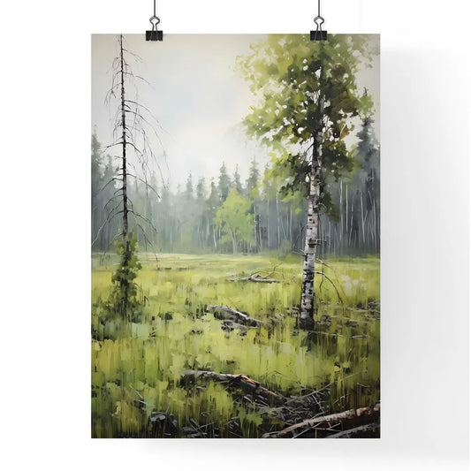A Poster of a painting of green forest trees - A Painting Of Trees In The Fog