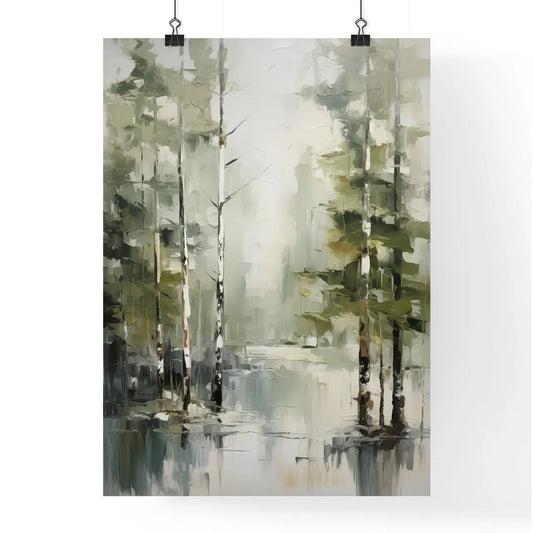 A Poster of a piece of acrylic painting - A Painting Of A Forest With Trees And Water