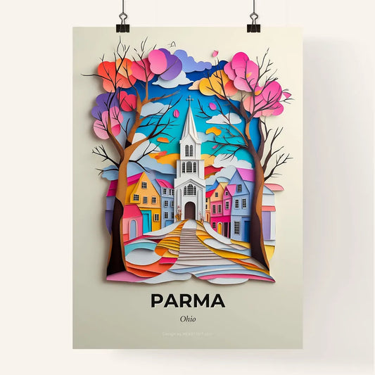 Vivid Parma, Ohio - a paper cut of a church and trees