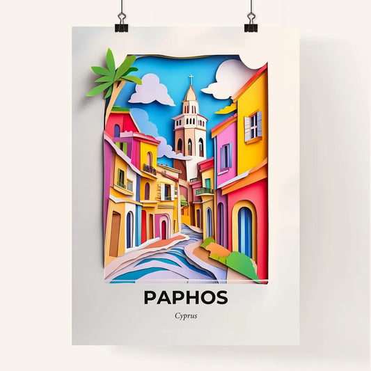 Vivid Paphos, Cyprus - a paper cut of a colorful city with a clock tower