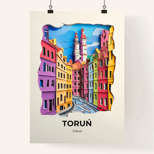 Vivid Toruń, Poland - a paper cut of a city street with a clock tower