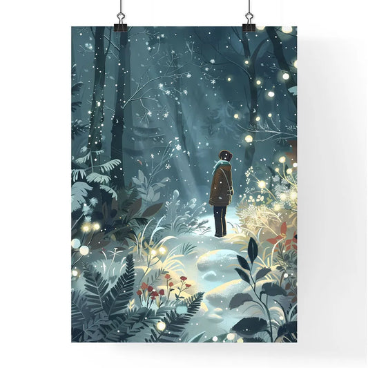 Wintry Wanderlust: Tranquil Landscape Painting of Snow-Covered Trees, Historic House, and Solitary Figure in Flowing Robe
