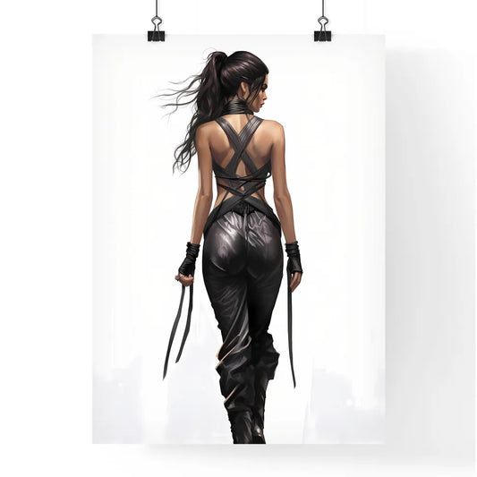 A Poster of concept art fashion concept - A Woman In Black Leather Pants With A Sword