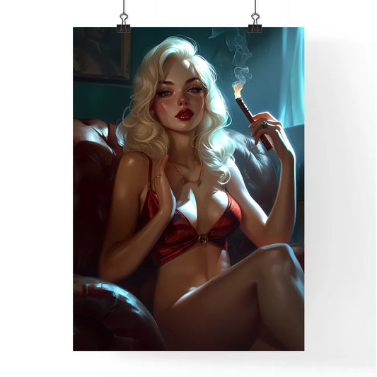 Pin up art TopEngineering Student from Cal Tech - Art print of a woman sitting on a leather couch holding a cigarette