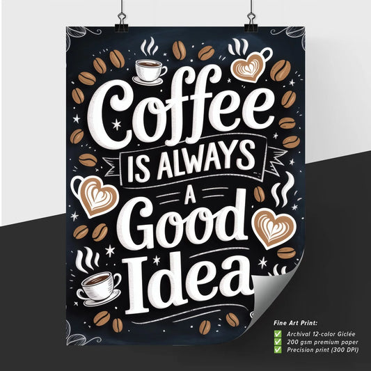 Whimsical Coffee Quote: 'Coffee is Always a Good Idea' with Illustrative Elements and Warm Colors.