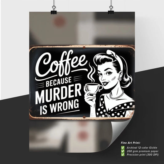 Vintage Coffee Sign with Humorous Message: ‘Because Murder is Wrong’ Featuring Classic Pin-Up Style