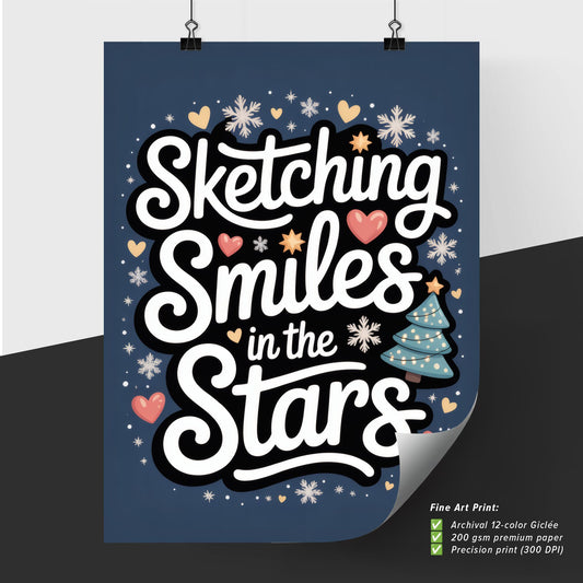 Whimsical Typography Design Featuring 'Sketching Smiles in the Stars' with Festive Elements and Colorful Accents.