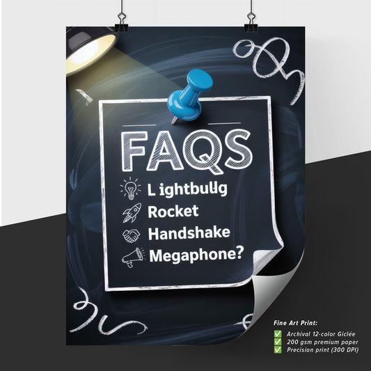 Creative FAQs Board with Lightbulb, Rocket, Handshake, and Megaphone Icons on Chalkboard Background.