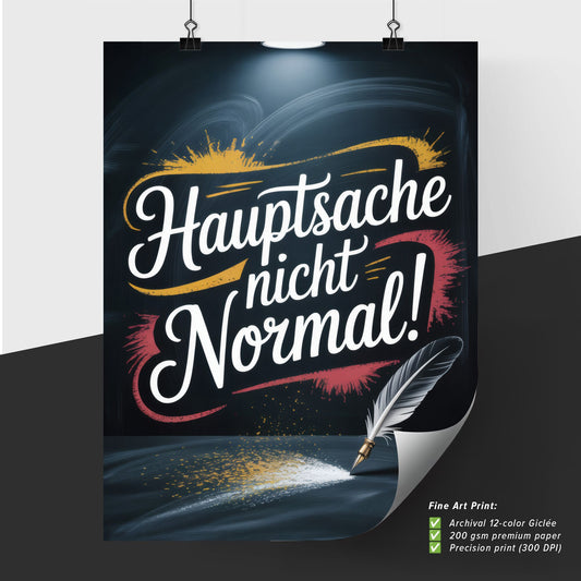 Creative Inspirational Phrase: 'Hauptsache nicht Normal!' Featuring Quill and Artistic Background.