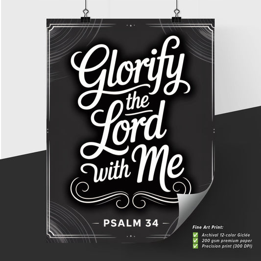 Elegant Typography Design Featuring Inspirational Message from Psalm 34: 'Glorify the Lord with Me' in Bold Letters.