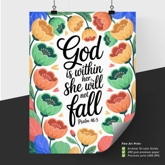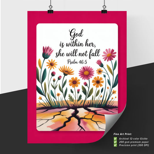 Empowering Floral Art Print Featuring Inspirational Quote: 'God is Within Her, She Will Not Fall' - Psalm 46:5