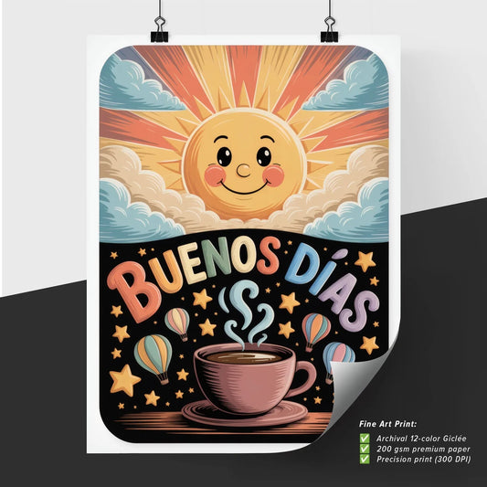 Colorful Morning Illustration Featuring a Cheerful Sun, Coffee Cup, and 'Buenos Días' Text with Hot Air Balloons.