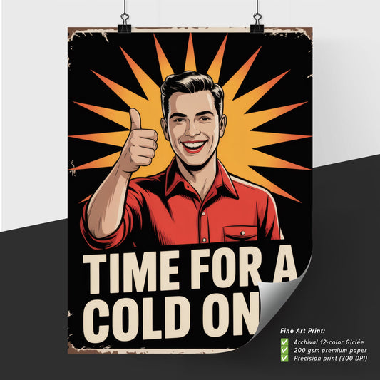 Cheerful Young Man Encouraging Enjoyment with a Refreshing Beverage in a Retro Style Advertisement