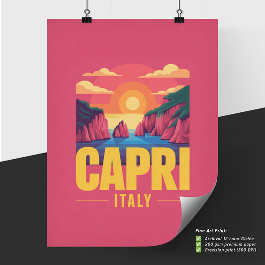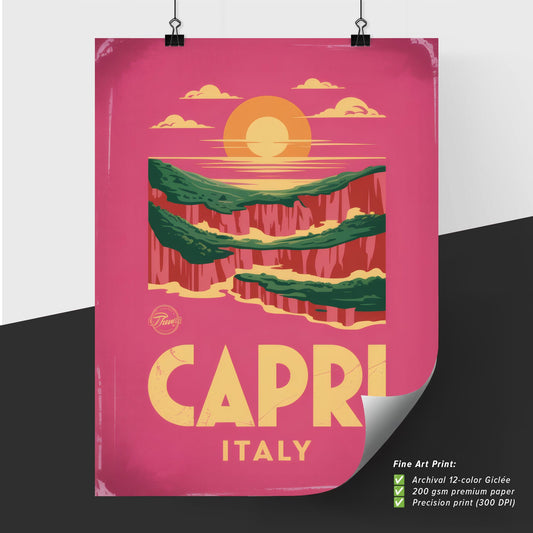 Vibrant Retro Travel Poster: Explore the Breathtaking Landscapes of Capri, Italy at Sunset.