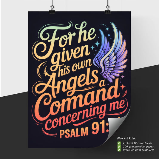 Vibrant Inspirational Typography Design Featuring Psalm 91:11 with Angelic Motifs and Colorful Background