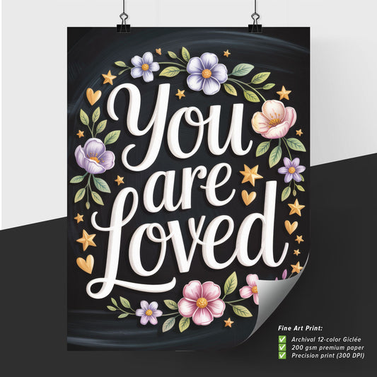 Beautiful Floral Typography Artwork: 'You Are Loved' on a Dark Background for Inspirational Home Decor.