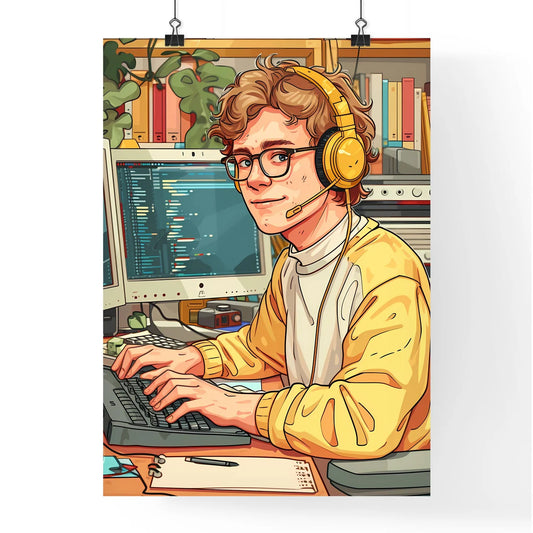 Today, surprise chats may lift your spirits - Art print of a man wearing headphones and typing on a keyboard